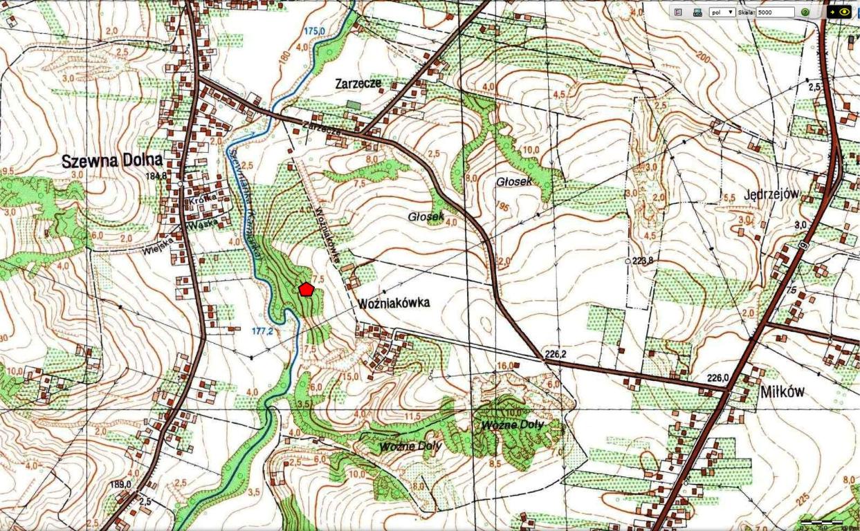 Skałka położona jest około 4 km na SSW od centrum Ostrowca Świętokrzyskiego. W miejscowość Stara Szewna należy skrecić w lewo w ulicę Zarzecze na Miłków i po ok. 230 m skręcić w prawo w ulicę Woźniakówka i przejechać jeszcze 390 m. Zatrzymać się przy grupie zabudowań po lewej stronie drogi, wejść do lasu i iść prosto na zachód ok. 140 m (rys. 1) |