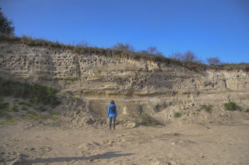 | 4. Opis geostanowiska: | W ścianach wyrobiska odsłania się profil utworów mioceńskich. Piaski te są na ogół średnioławicowane (Fig. 2). Są to jasnożółte piaski kwarcowe dość dobrze wysortowane. W piaskach tych można zaobserwować się warstwowanie poziome, równoległe oraz przekątne (Fig. 3). W osadach tych są obecne całe i pokruszone muszle małży (Fig. 4) i ślimaków (Fig. 5). Utwory te należą do warstw baranowskich formacji z Pińczowa. Powstały one w płytszym przybrzeżu morskim. |