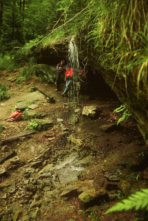 | 4. Opis geostanowiska: | Jaskinia występuje w obrębie piaskowców i zlepieńców warstw istebniańskich (kreda dolna) jednostki śląskiej. Stanowi ona praktycznie jedną, obszerną i lekko pochyloną salę (jedną z największych w jaskiniach beskidzkich), która połączona jest z powierzchnią dużym, soczewkowatym otworem. Na dnie jaskini, zbudowanym z gliniastego gruzu występują rzadkie większe głazy. Stokiem ponad jaskinią spływa potok tworzący wodospad w jej otworze. Pod względem kształtu i genezy jaskinia jest odmienna od większości jaskiń beskidzkich, bowiem jej powstanie nie wiąże się z ruchem grawitacyjnym wielkich mas skalnych. Reprezentuje ona typ warstwowy (bedding type) jaskiń pseudokrasowych i jej powstanie wiąże się z procesami wietrzenia, zwłaszcza mrozowego oraz prawdopodobnie podziemnej erozji wodnej (sufozji).