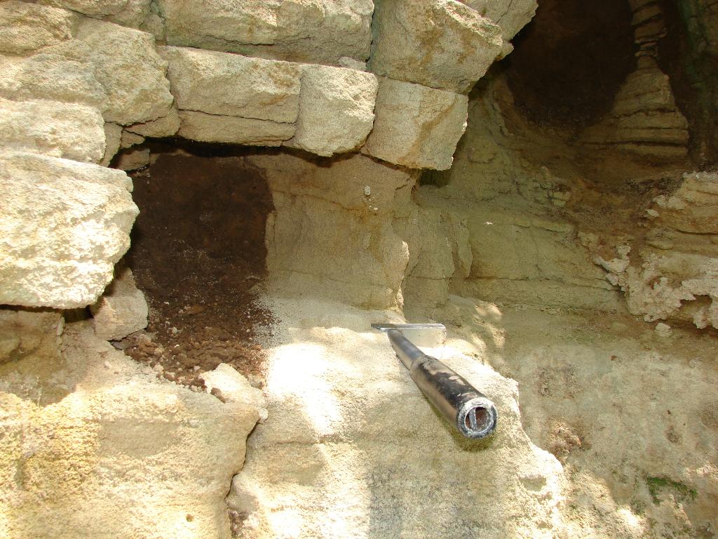 W strefie przypowierzchniowej kanały bywają zazwyczaj puste; niżej są czasem wypełnione czerwoną gliną. Glina ta składa się z cząstek ilastych i pyłowych stanowiących domieszkę w wapieniach i pozostałych po ich rozpuszczeniu i wypłukaniu. Oprócz różnego kształtu i orientacji kanałów są w obrębie wapieni ziarnistych miocenu rzadsze soczewkowate ciała skalne ograniczone powierzchniami warstwowania i zbudowane z glin czerwonych analogicznych do wyżej opisanych. Z kanałami wiąże je więc typ wypełniającego osadu, a różni zgodne z warstwowaniem położenie. Uniemożliwia ono natychmiastowe przyjęcie hipotezy utworzenia tych ciał w obrębie wcześniej istniejącej skały. Jednak bliższe obserwacje gliny jak również nierównych, krasowych powierzchni wapieni otaczających gliny pozwala ustalić, że materiał gliniasty nagromadził się później, w obrębie istniejącej już skały.