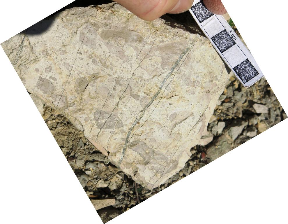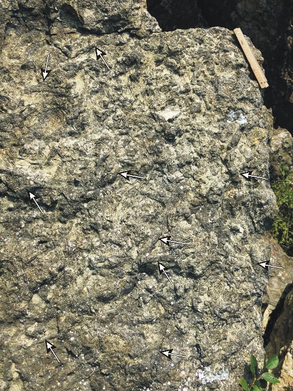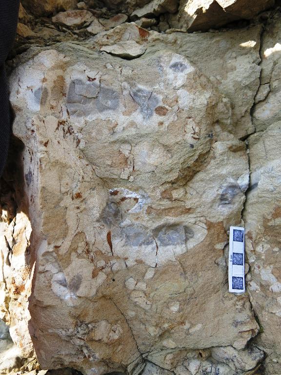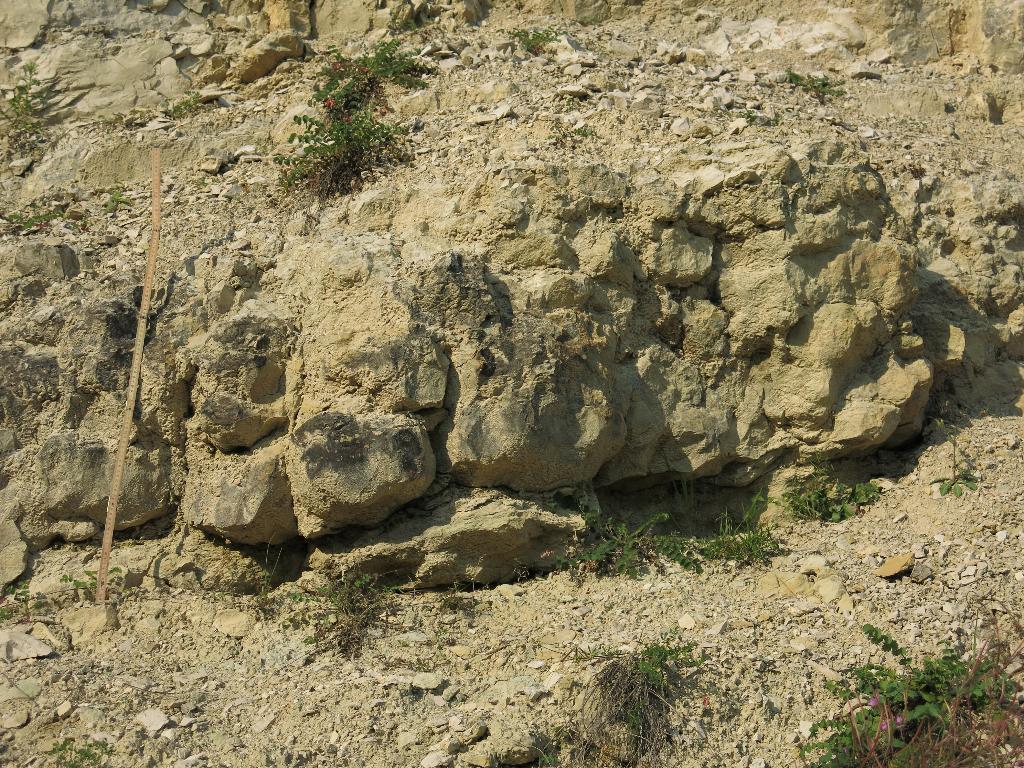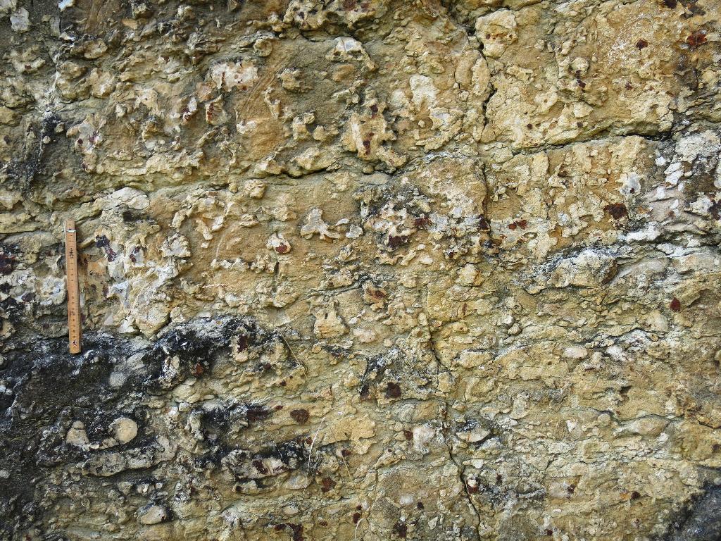W nadległych paru metrach profilu, gdzie odsłonięte są najmłodsze warstwy skalne, w wapieniach obserwuje się stopniowy powrót struktur gąbkowych i plam tuberoidowych. |