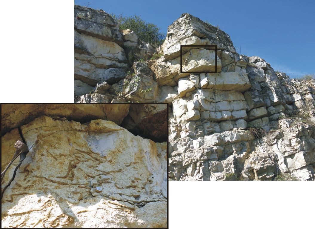 Stropowe powierzchnie zwietrzałych bloków, nagromadzonych u podnóża ścian, będące górnymi powierzchniami ławic, często urzeźbione są nieregularnymi zagłębieniami i pokryte śladami pełzania bezkręgowców po morskim dnie (fot. 4). W pionowym przekroju analogiczne systemy kanałowe, impregnowane krzemionką, wypreparowane zostały na zwietrzałych powierzchniach ścian skalnych (fot. 5).