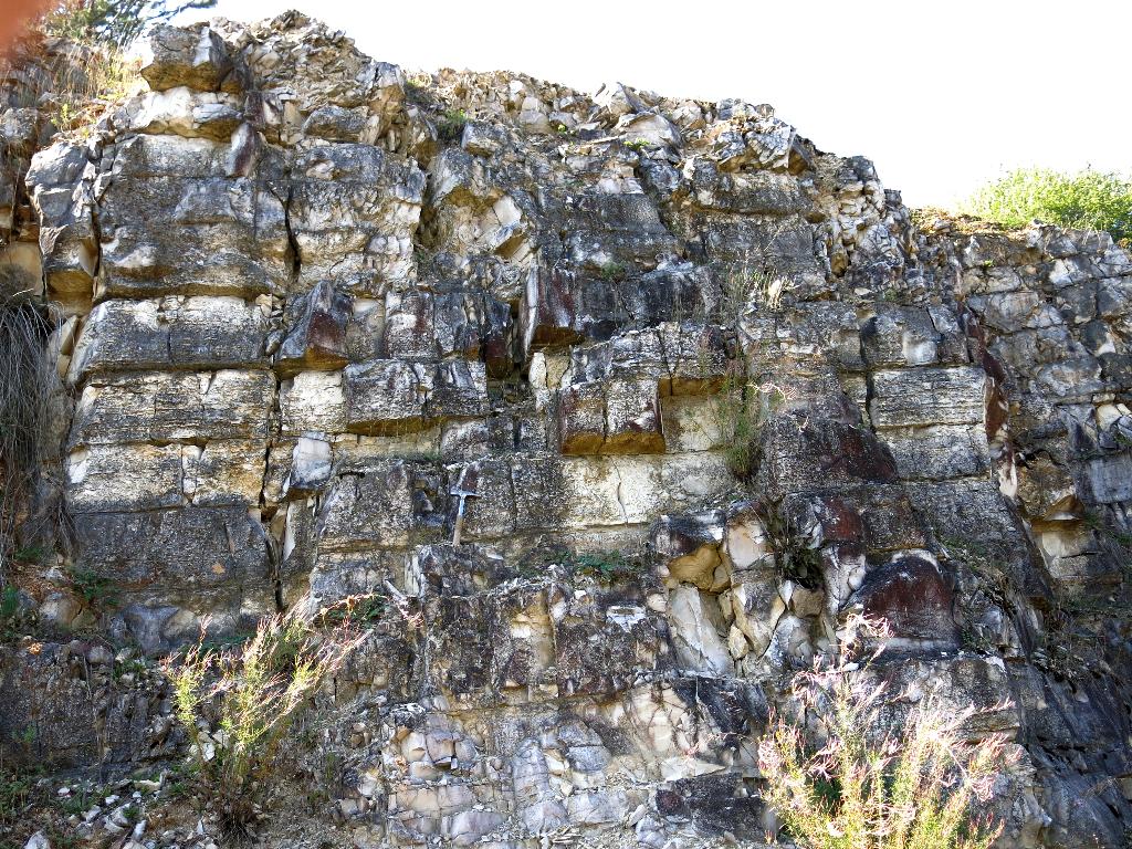 W południowej ścianie kamieniołomu, w niższej części profilu o miąższości 2,5 metra, odsłonięte są ławice jasnoszarych wapieni z licznymi smużystymi strukturami gąbkowymi (fot. 10) i drobnymi plamkami tuberoidowymi. Wyższą część profilu, o miąższości blisko 10 metrów, tworzą jasnoszare wapienie, zbudowane z kopalnego mułu węglanowego, w skale mającego postać drobnokrystalicznego kalcytu. Spotyka się w nich kuliste konkrecje jasnoszarych krzemieni o średnicy kilku centymetrów. Wapienie te są pozbawione skamieniałości i struktur biogenicznych, charakterystycznych dla niższej części profilu. Wietrzenie ujawniło poziome warstwowanie ławic wapiennych (fot. 11), uformowane pod wpływem prądów dennych, a ponadto trudno dostrzegalne, pionowe ślady kanałów mieszkalnych, wykonanych przez bezkręgowce w przydennej warstwie wapiennego osadu (Pieńkowski et. al. 2008).