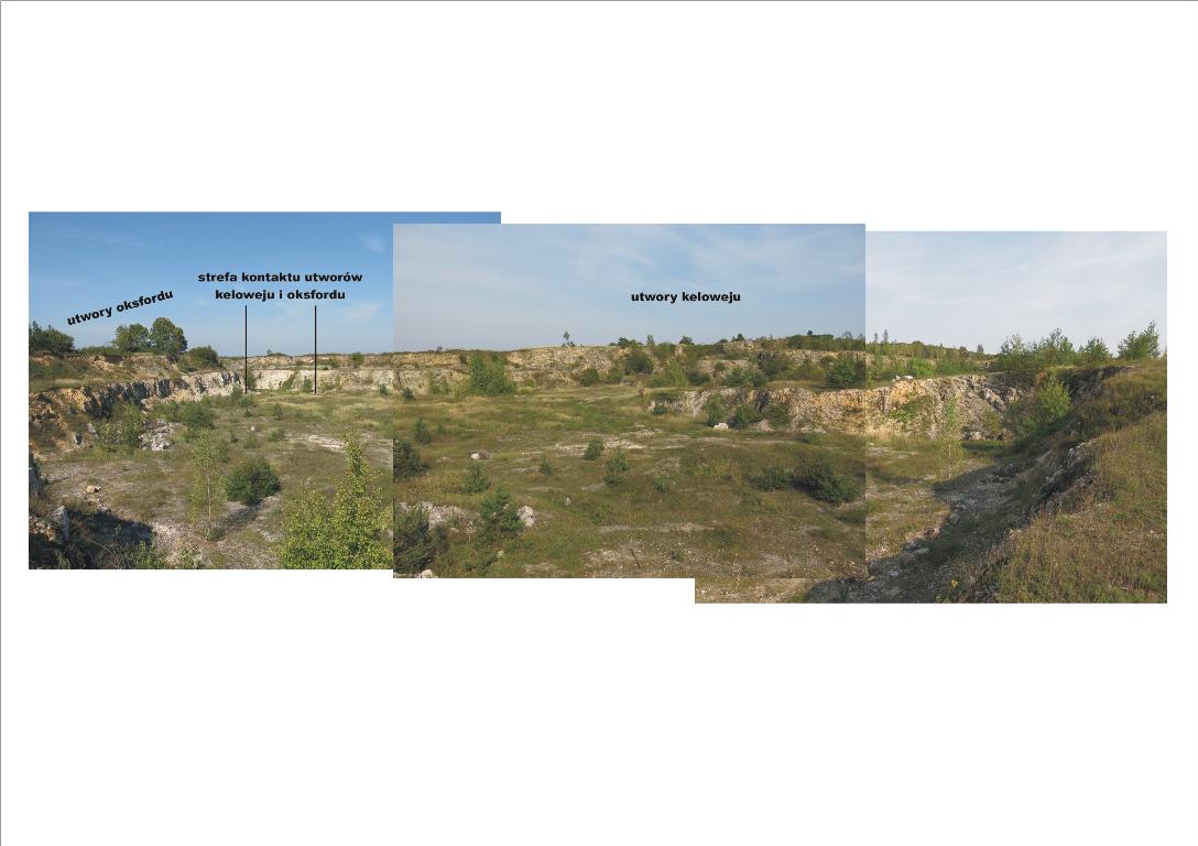 W południowo-zachodnim narożniku kamieniołomu (fot. 1) widoczne jest przejście od środkowojurajskiej sedymentacji piaszczysto-ilasto-węglanowej (piaszczystych margli krzemionkowych z igłami gąbek) do - charakterystycznej dla jury górnej - sedymentacji węglanowej (wapieni), okresowo ilasto-węglanowej (margli). Zmiana ta nastąpiła w obrębie jednej ławicy - warstwy skalnej o miąższości około 60 cm (fot. 6). Widoczna miejscami jej wewnętrzna "struktura bulasta" (fot. 3), jest efektem procesów diagenetycznych. W jasnoszarych wapieniach tworzących górną część ławicy, tak jak w warstwach nadległych, obserwuje się: 1- struktury gąbkowe, z charakterystyczną siateczkową budową wewnętrzną (fot. 7); 2 - smużyste struktury sinicowe (stromatolity), często z drobnym warstwowaniem (fot. 8); 3 - liczne drobne plamki, tzw. tuberoidy, będące strukturami pozostawionymi przez gnijące ciała gąbek i cyjanobakterie. Ponadto stosunkowo licznie napotkać można drobne amonity, belemnity i muszle ramienionogów (fot. 9).